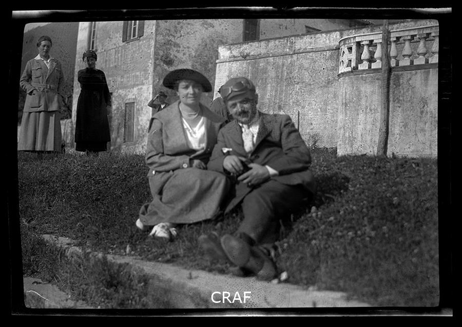Ritratto di uomo e donna seduti sul prato di una villa, sullo sfondo altre due...