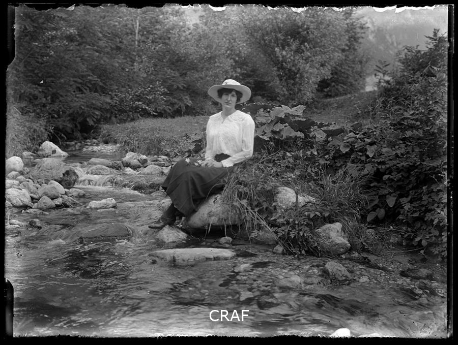 Ritratto di donna seduta su di una roccia sulla riva di un ruscello