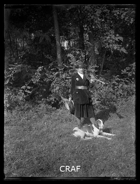 Una cacciatrice con il suo cane ed in mano un fagiano morto