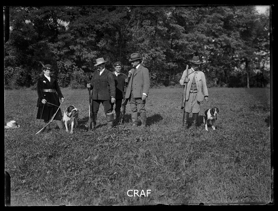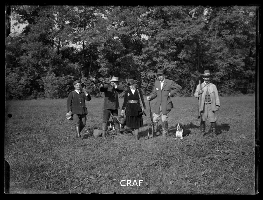 Gruppo di cacciatori tra cui una donna assieme ai cani da caccia