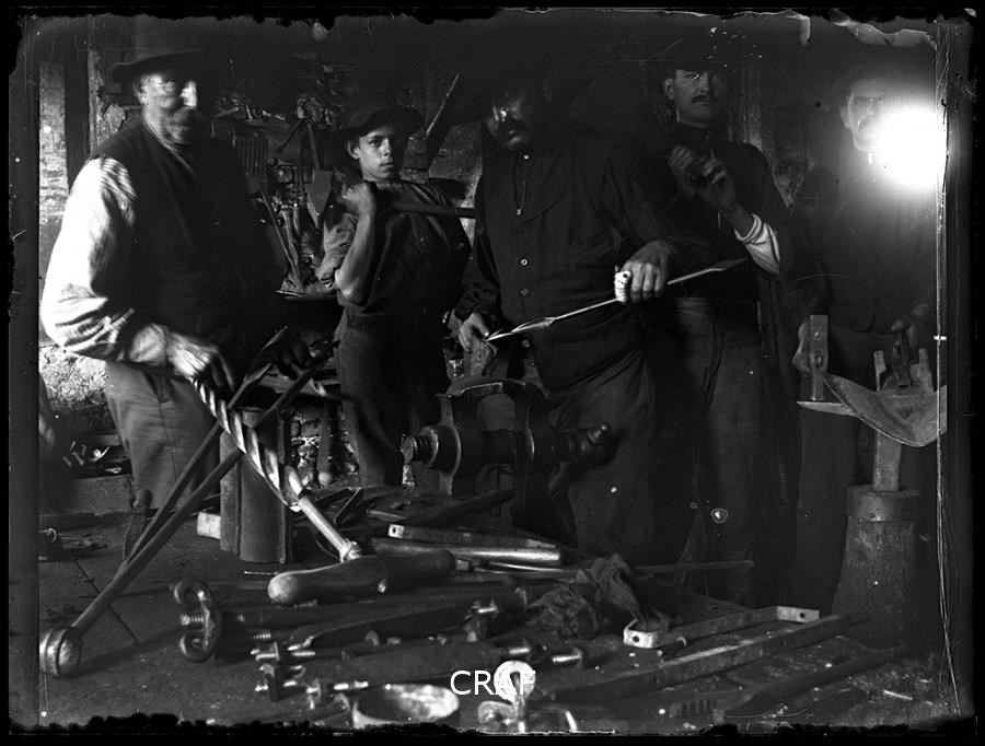 Ritratto di uomini al lavoro all'interno di un'officina