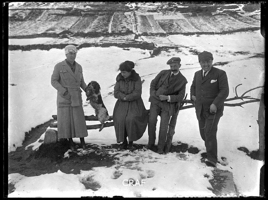 Ritratto di gruppo in esterno di due donne e due uomini assieme ad un cane...