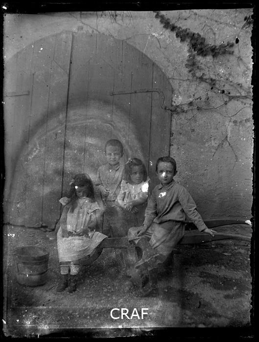 Ritratto di gruppo in esterno di due bimbe e due bimbi appoggiati ad una...