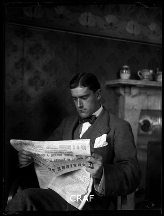 Ritratto di un uomo seduto mentre legge il quotidiano "Il Corriere della sera"...