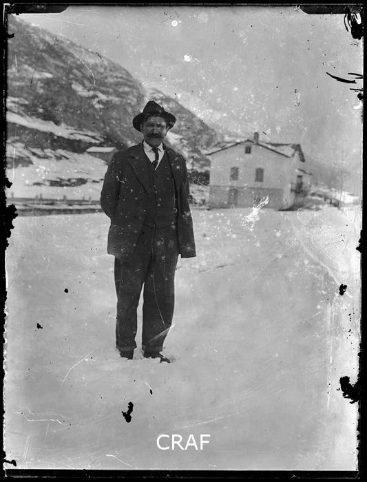 Uomo con cappello ritratto in esterno a figura intera su di un prato innevato