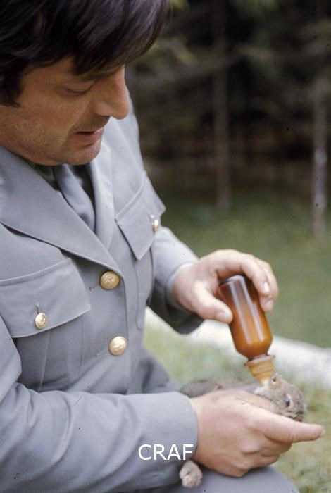 Ritratto di una guardia forestale che nutre un piccolo animale.