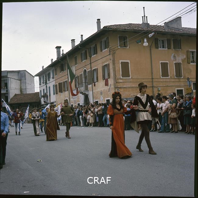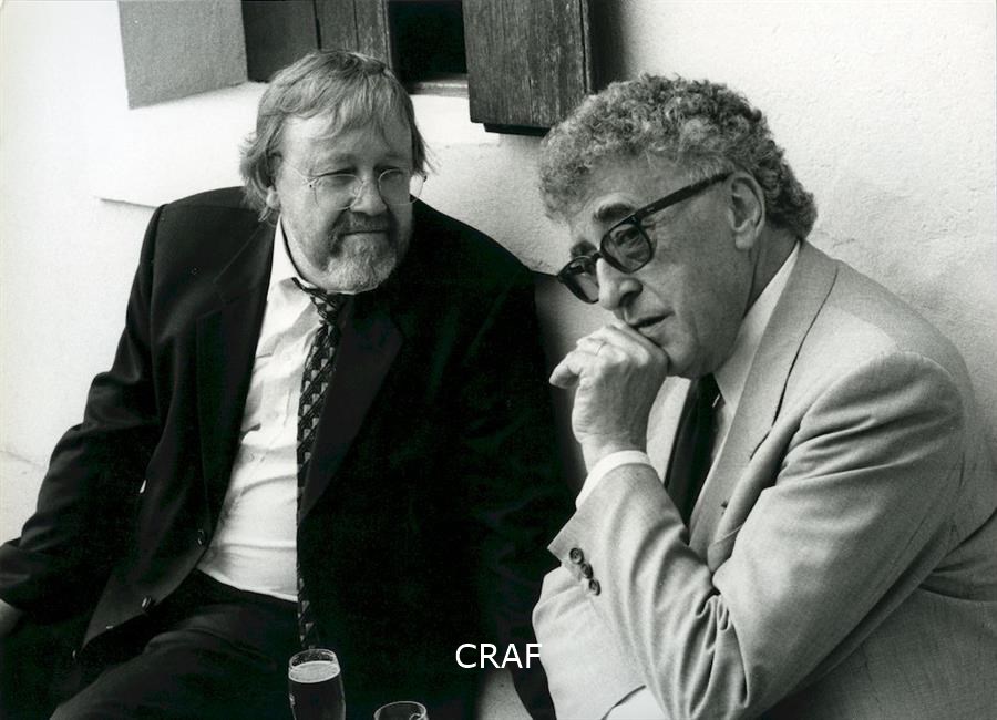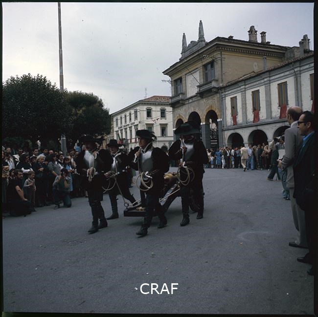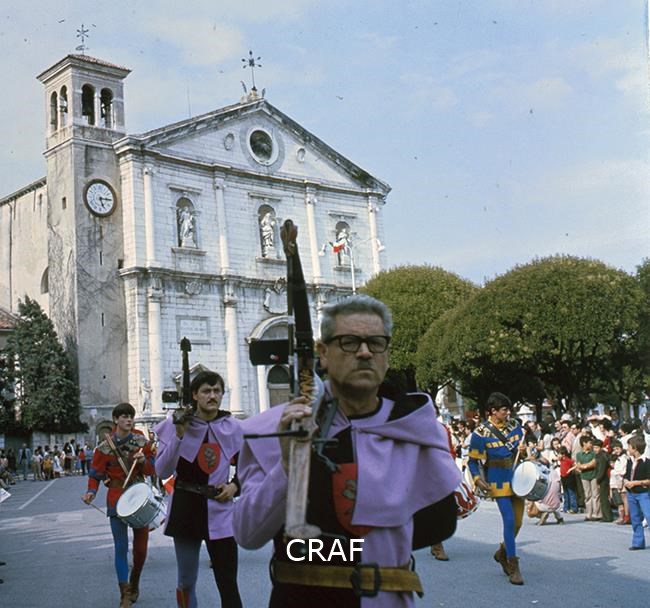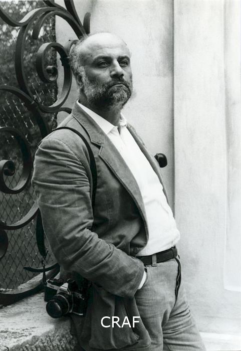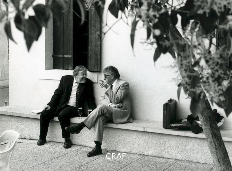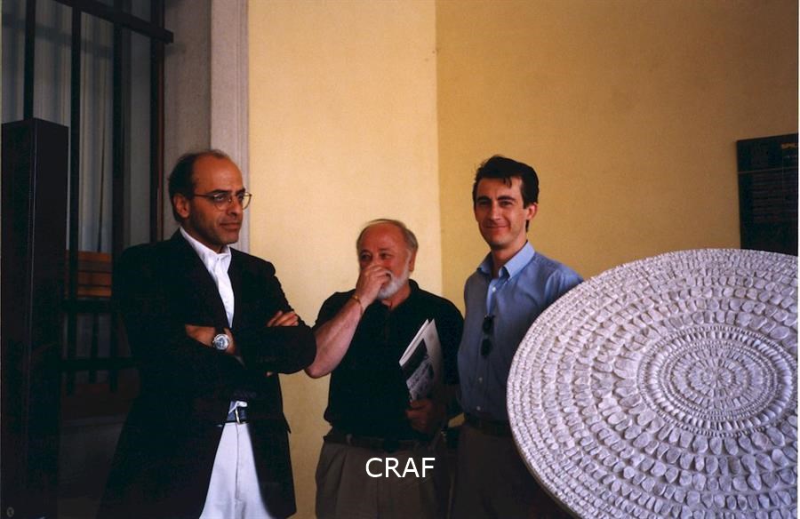 I tre laureati del premio FVG Fotografia in occasione dell'inaugurazione di Spilimbergo Fotografia '98: Roberto Koch, Giuliano Borghesan e Francesco Nonino davanti al rosone di Nane Zavagno.
