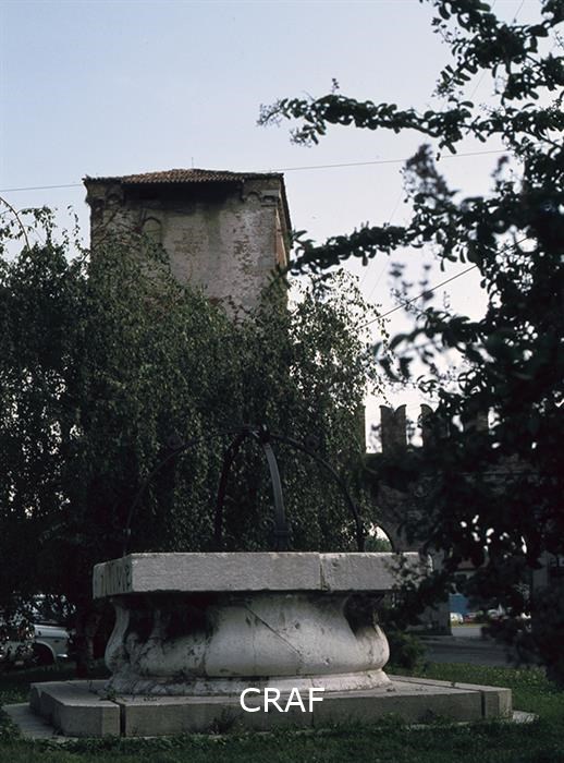 Veduta del pozzo nell'omonima piazza e Porta Aquileia sullo sfondo.
