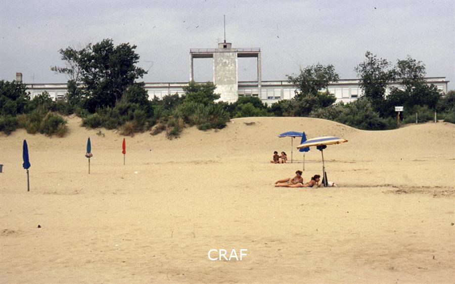 Veduta della spiaggia con la colonia elioterapica sullo sfondo.