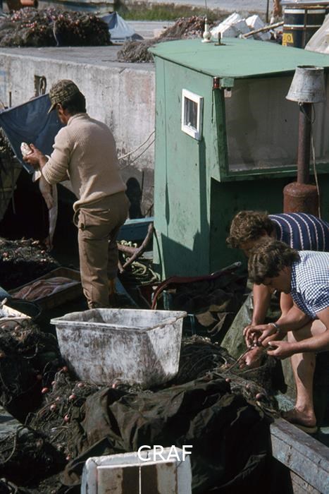 Pescatori sistemano le reti al porto.