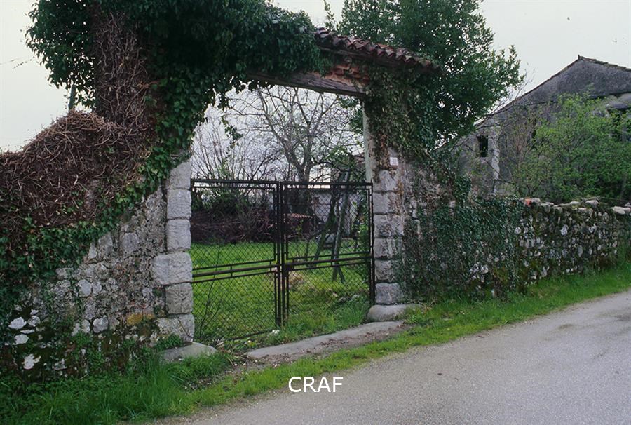 Dettaglio di un muro di cinta di pietra con cancello.