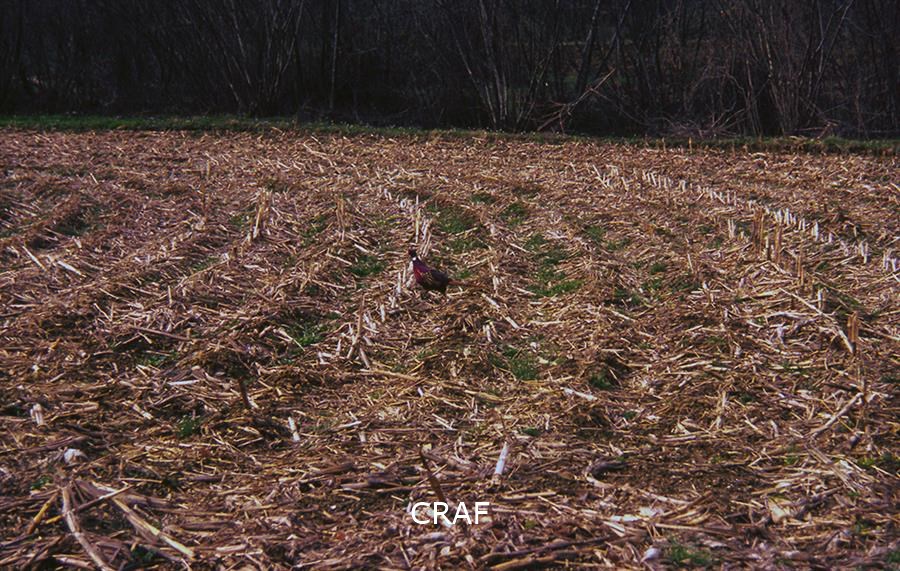 Scorcio di un campo di mais mietuto con fagiano al centro.