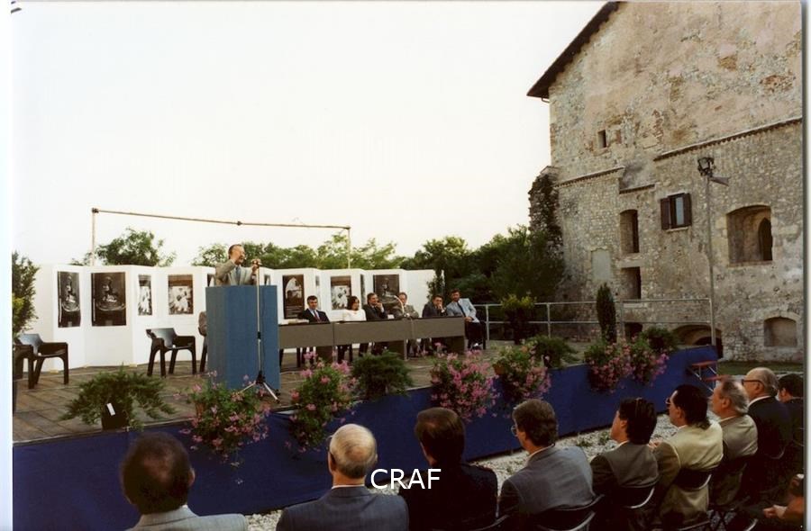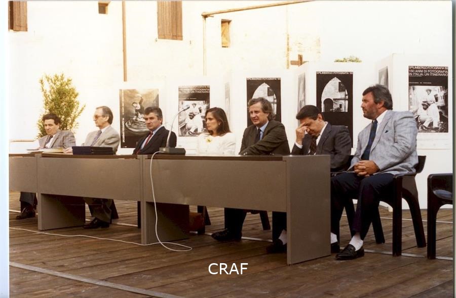 Sul palco all'inaugurazione di Spilimbergo Fotografia 89'. Gianni Colledani, Italo Zannier, Ettore Rizzotti, Simona Fede, Armando Angeli, Dante Gerometta, Vertilio Battistella