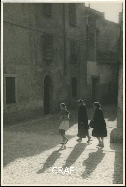 Scorcio di un vicolo: due donne e una bambina attraversano la strada.