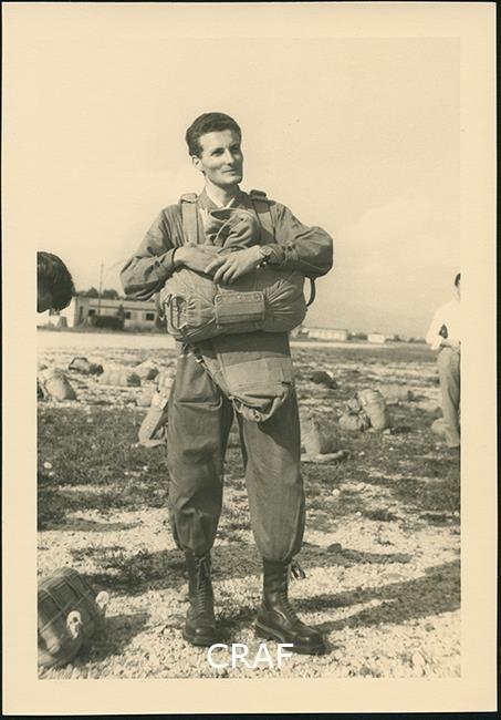 Paracadutista posa con lo zaino del paracadute in un'area militare.