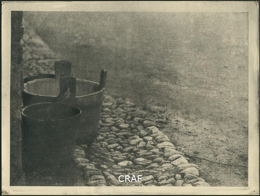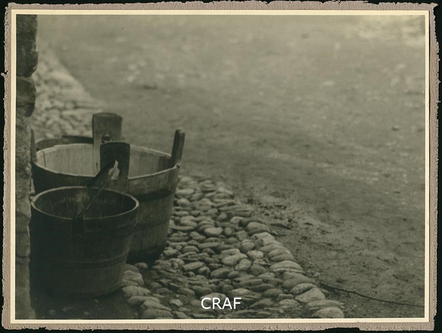 A sinistra un mastello tra due secchi su un marciapiede di ciottoli