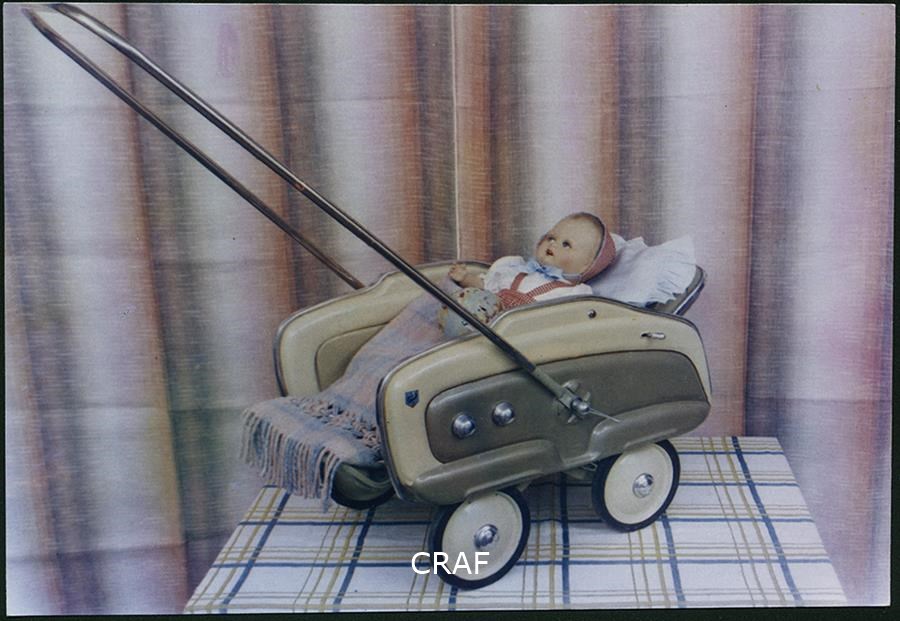 Passeggino con bambola posto sopra un tavolo con un tendaggio come sfondo.