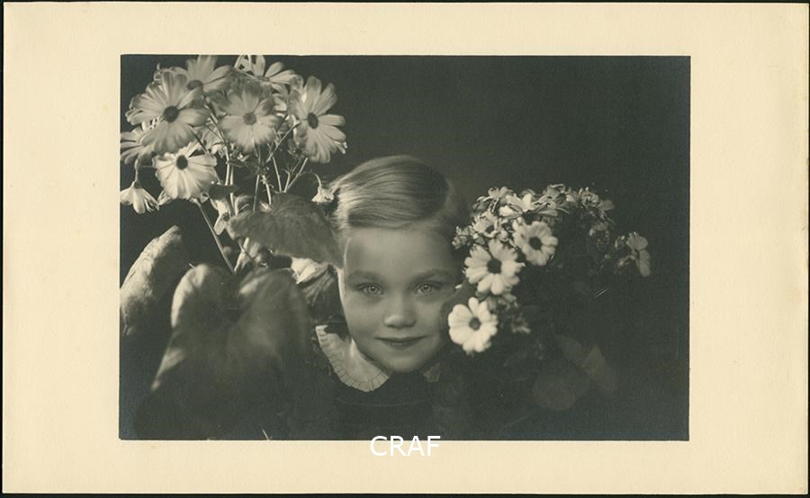 Ritratto del figlio Mario al centro fra due piante fiorite.