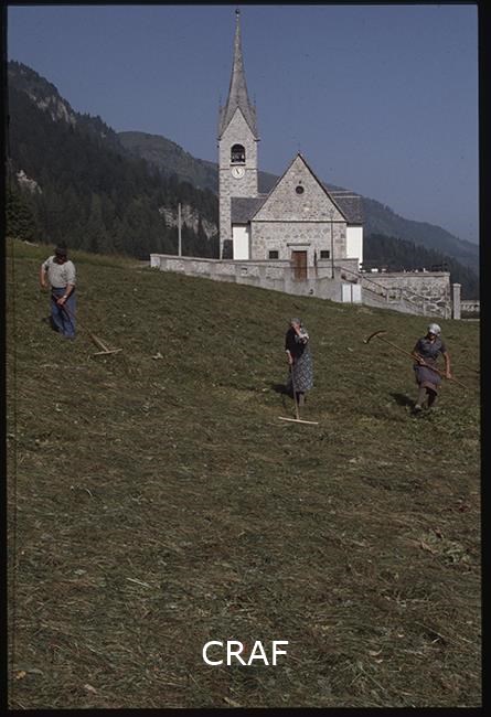 Tre persone raccolgono il fieno davanti alla chiesa di San Lorenzo