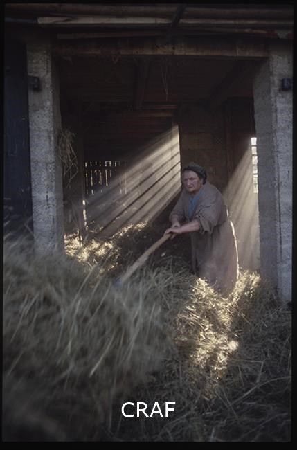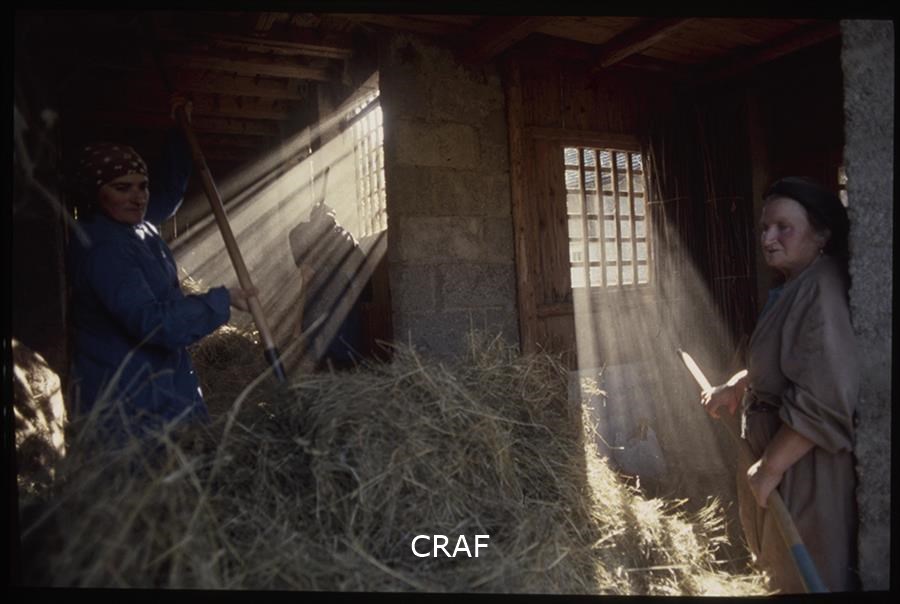 Donne rivoltano il fieno nel fienile