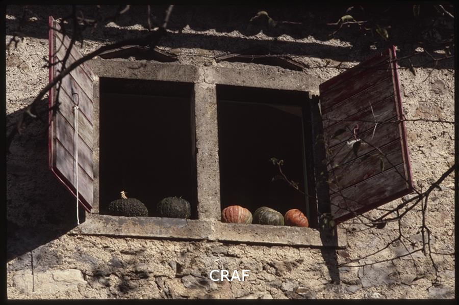 Dettaglio di una finestra con le zucche sul davanzale