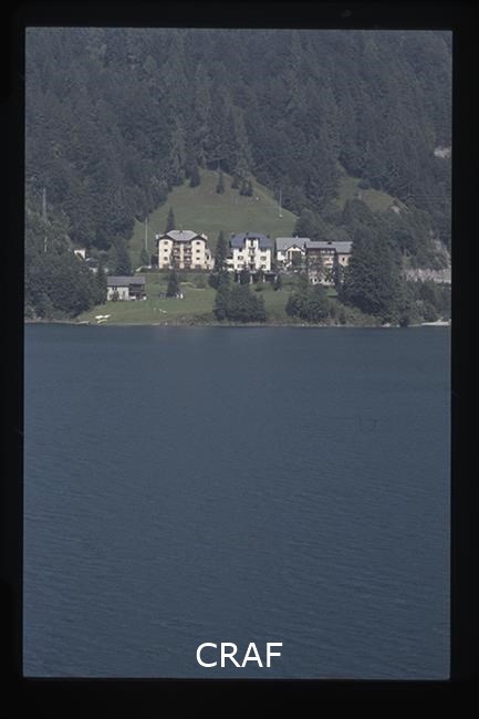 Veduta di case sulla sponda del lago di Sauris
