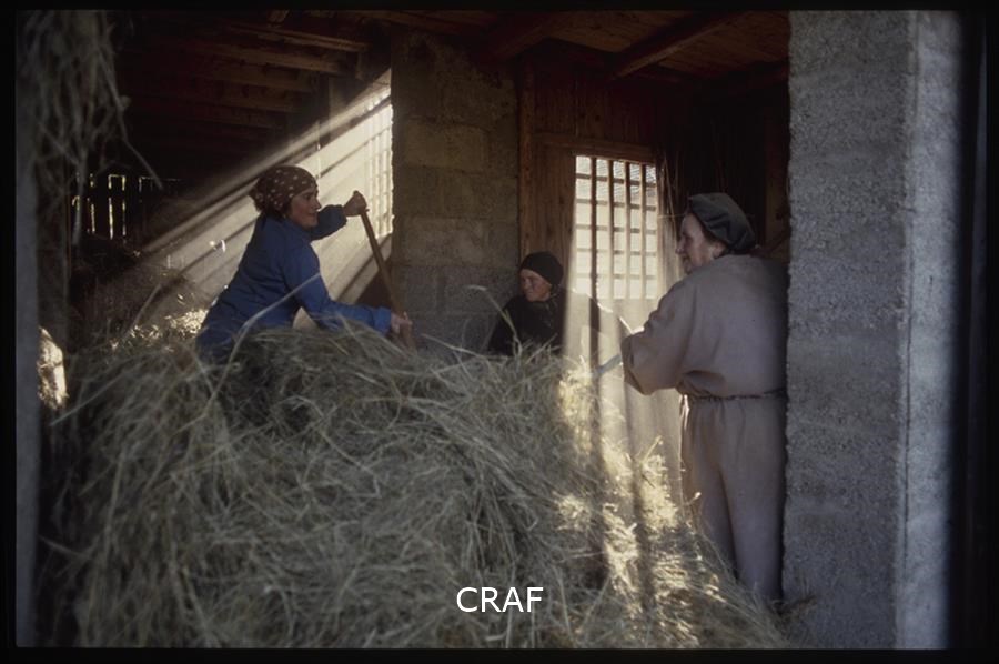 Donne rivoltano il fieno nel fienile