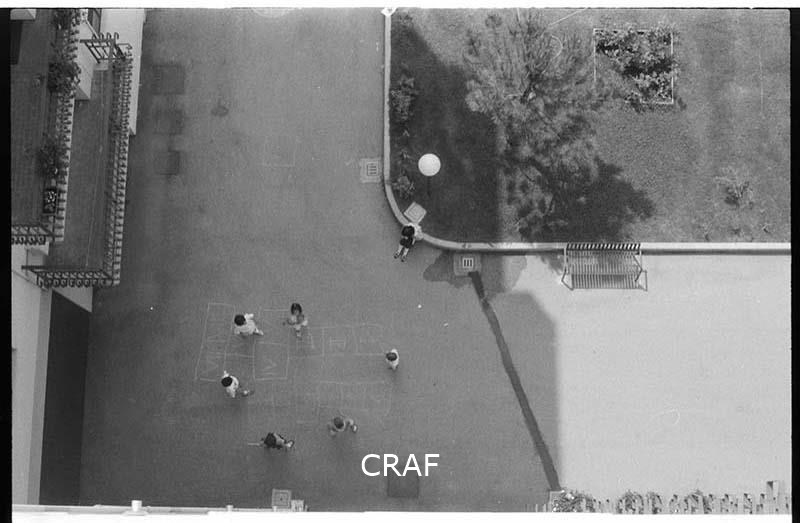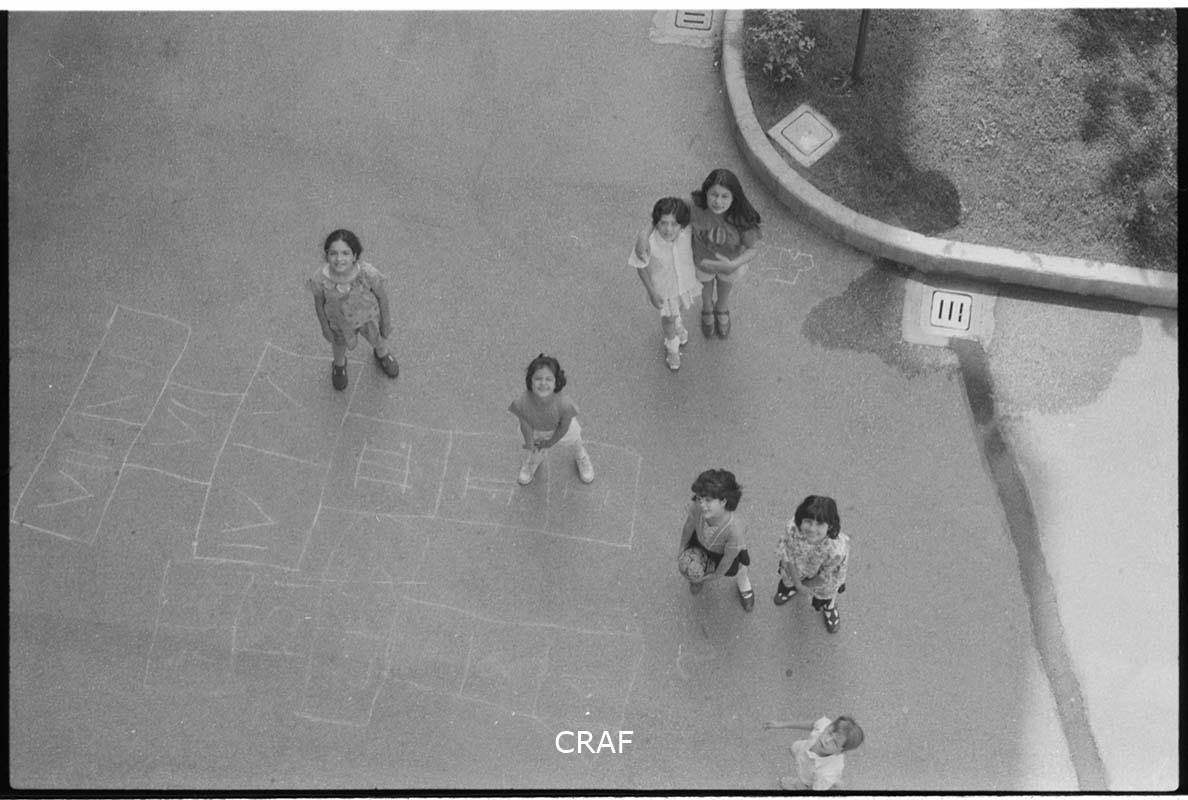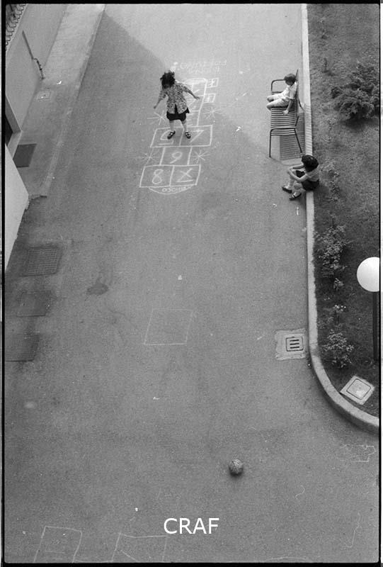 Una bambina ripresa dall'alto mentre gioca a campana nel cortile del condominio...