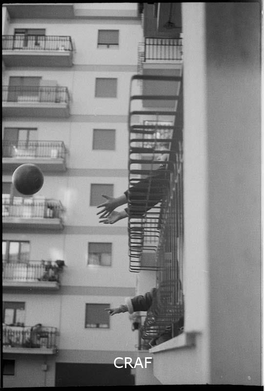 Le mani di un bambino sporgono dal parapetto di uno dei balconi del condominio...