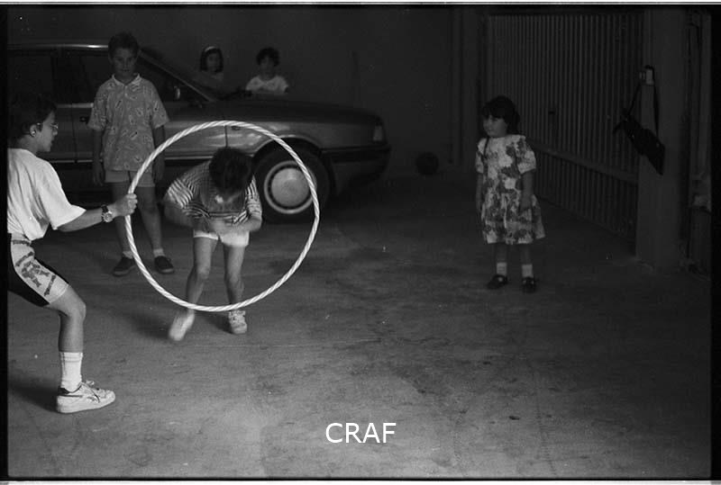 Un gruppo di bambini gioca con un cerchio "hula hoop" davanti ai box auto nel...