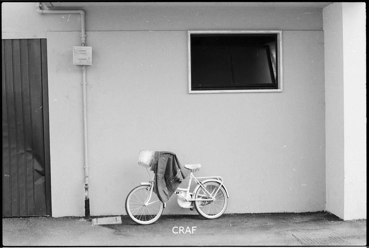Una bicicletta da bambina appoggiata alla parete nell'area dei box auto del...