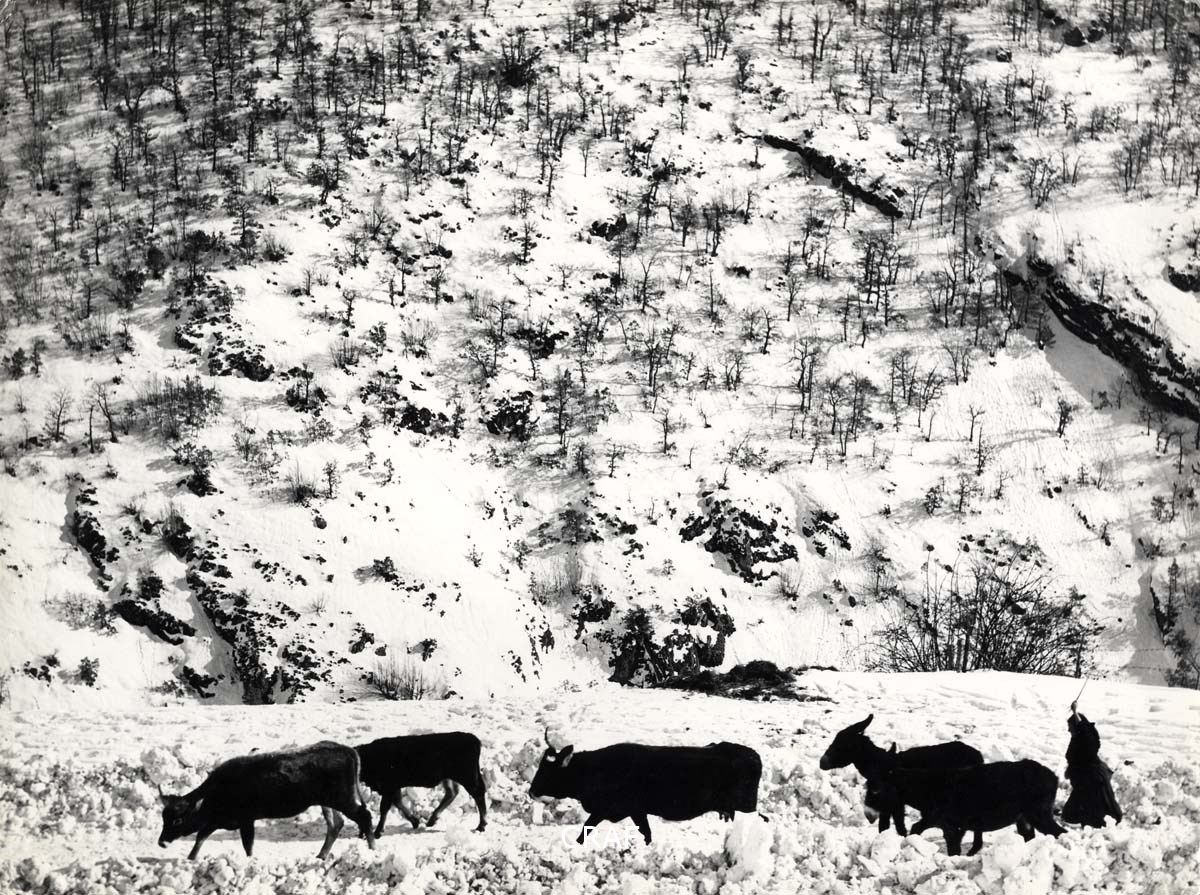 paesaggio, persona, donna, animali, mucche, asini, neve