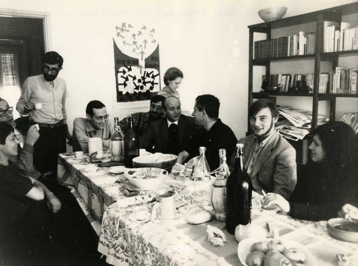 persone, tavola, pranzo, bottiglioni, scaffale, libri
