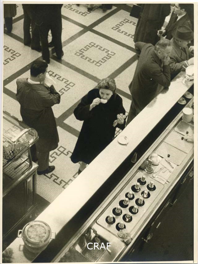 Bar di una stazione ferroviaria? Un uomo si soffia il naso; una donna beveun...