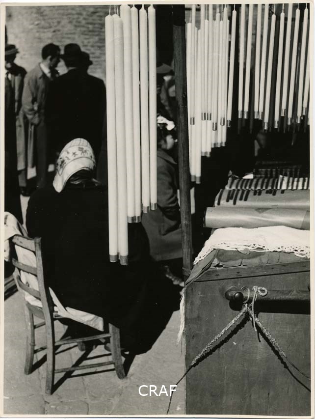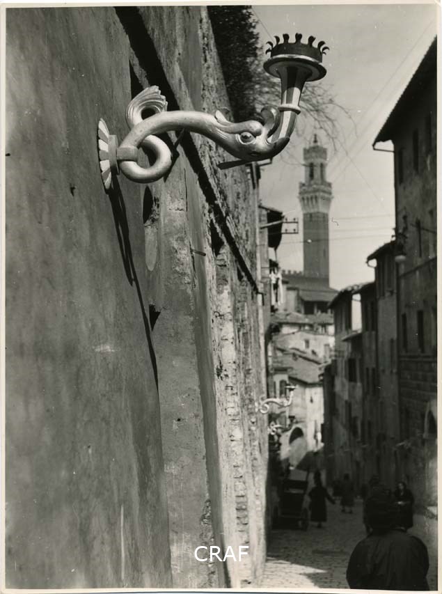 Vicolo in discesa con persone e carretto. Sullo sfondo il palazzo pubblicoe la...