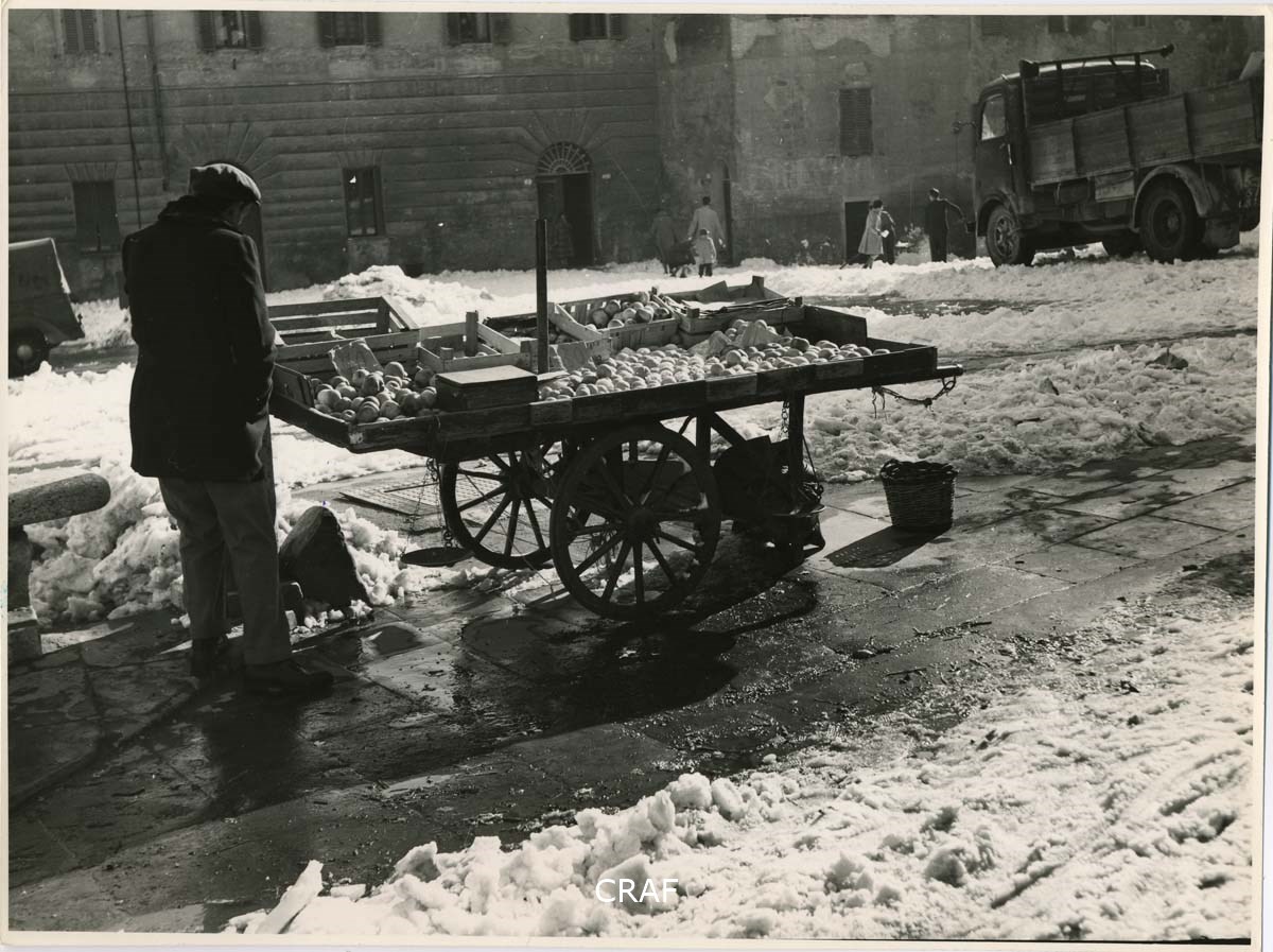 piazza, persone, venditore ambulante, carrettino, mele, camion, neve