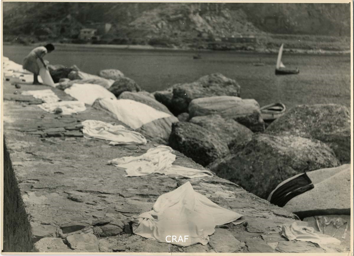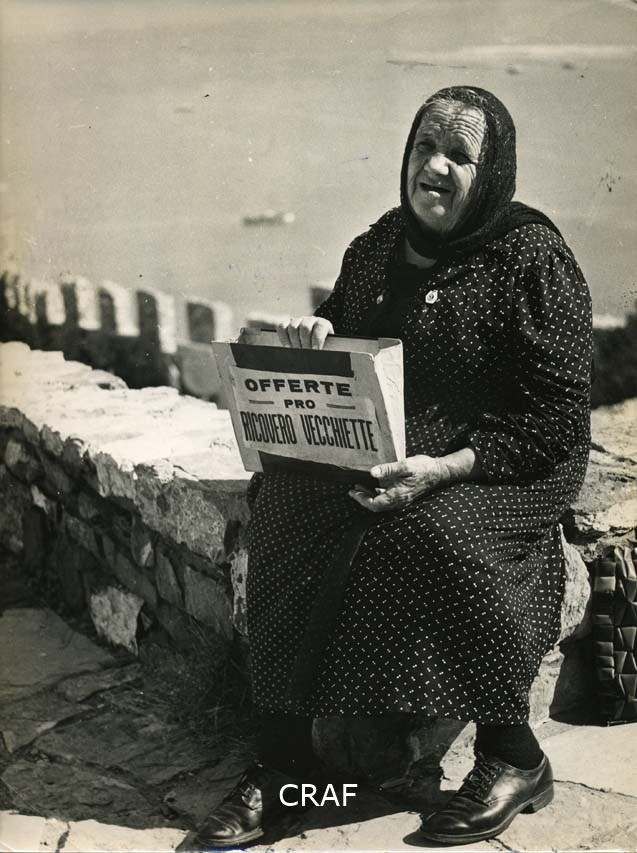 Donna anziana vestita di scuto con fazzoletto nero in testa; tiene apertesul...