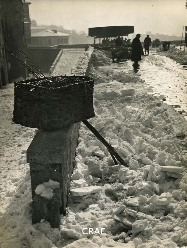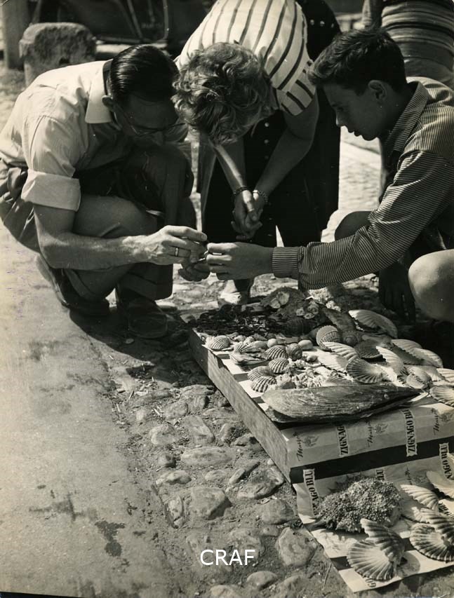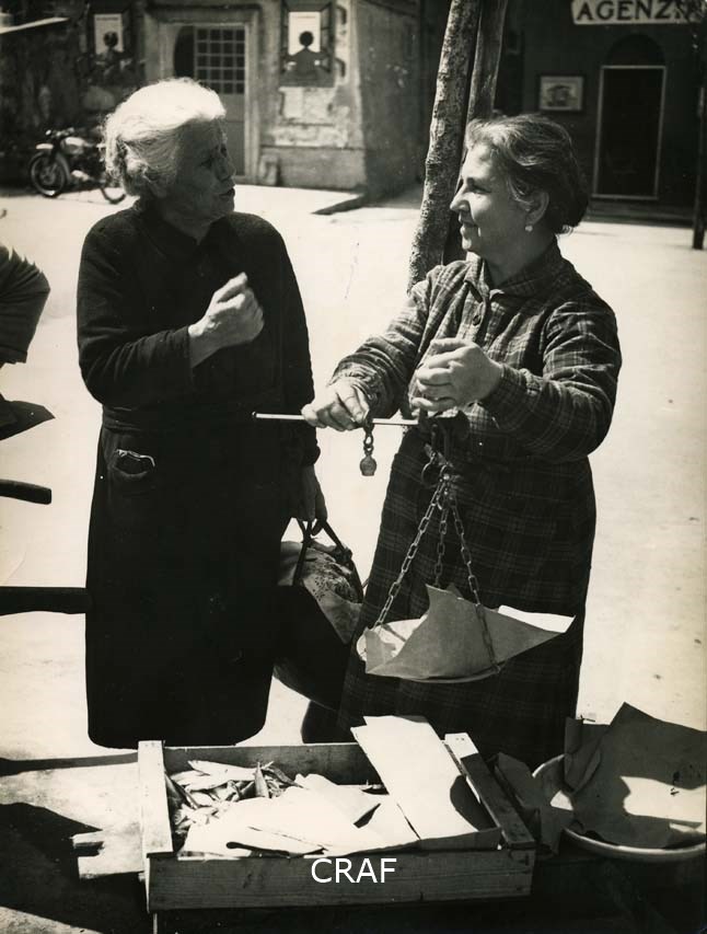 Ambulante che con una stadera in mano pesa del pesce; cassetta opn pesce...