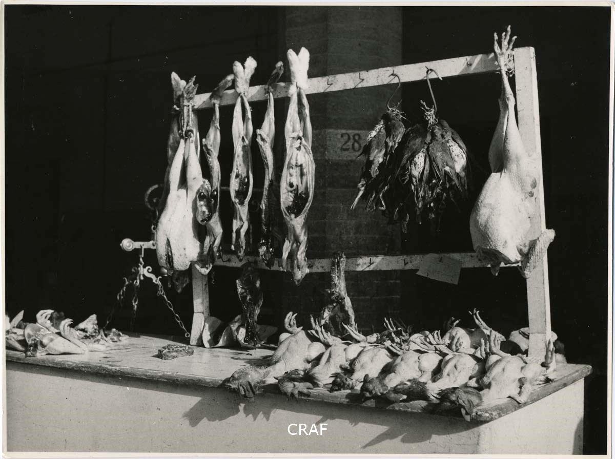 Capponi; tacchini; lepri o conigli; colombi; pezzi tagliati sul piano; stadera...