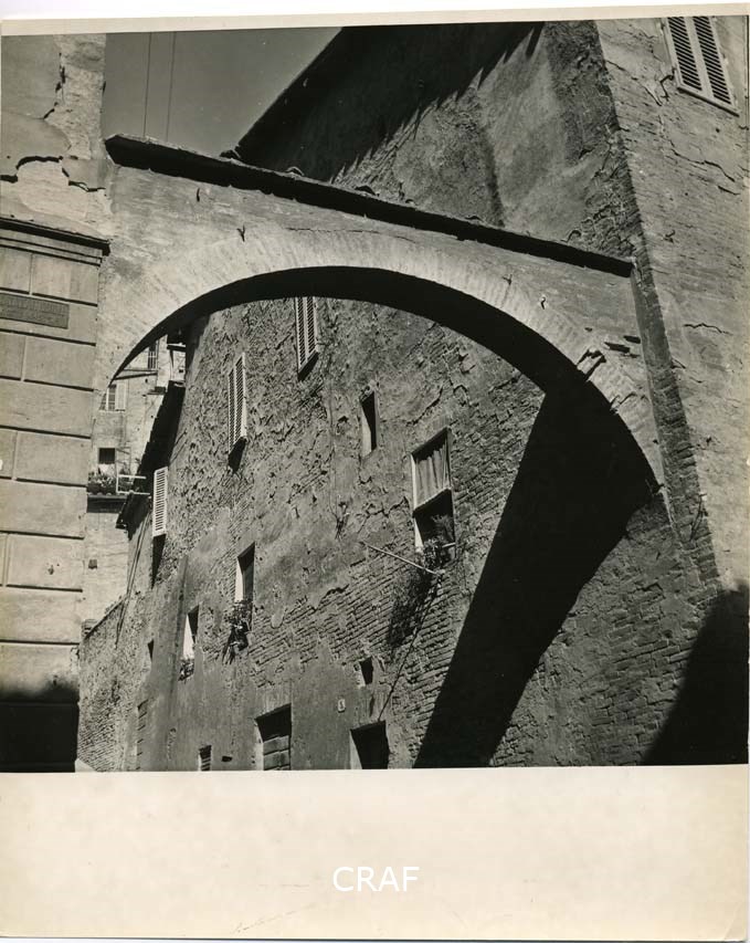Ripresa dal basso in alto; Edificio in mattoni con balconi stretti e intonaco...