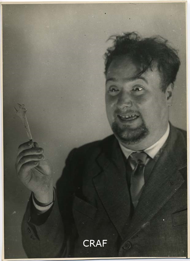 Uomo con pizzo dall'espressione entusiasta; l'arnese in mano è una chiave