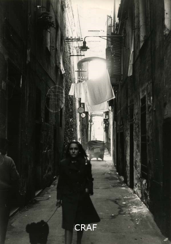 vicolo, case, persone, uomo, ragazza, cane, motocarro