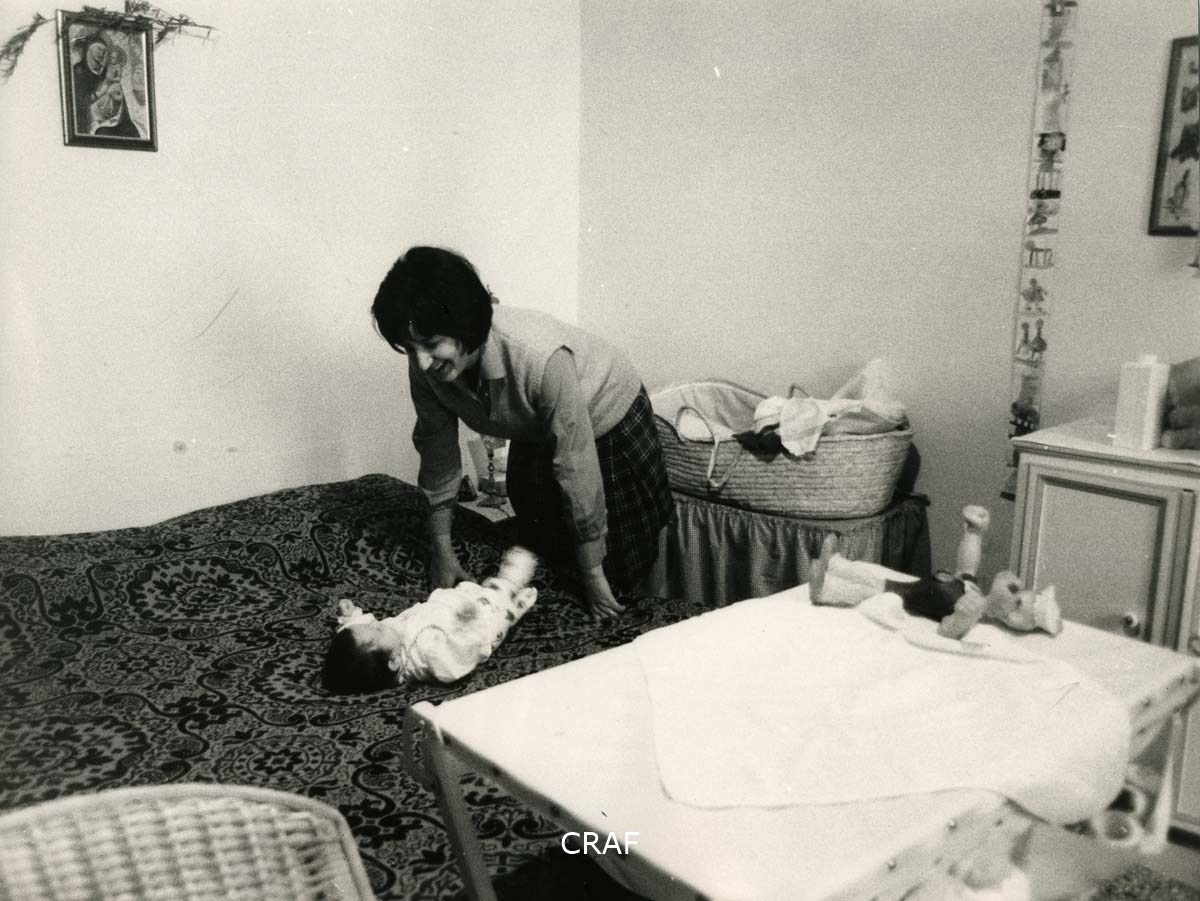 persone, donna, bambino, camera, letto, cesta, ripiano