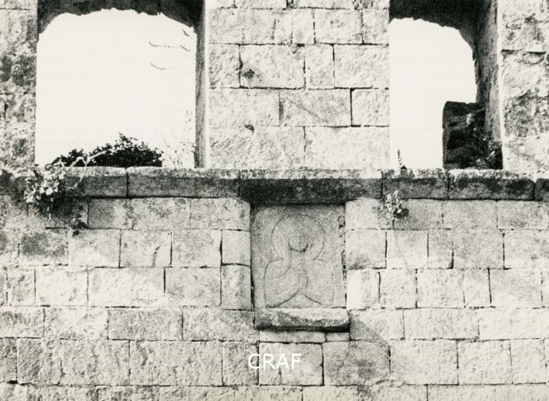 campanile, muro, celle, pietre, cornice, formelle, bassorilievo, santa, vegetali
