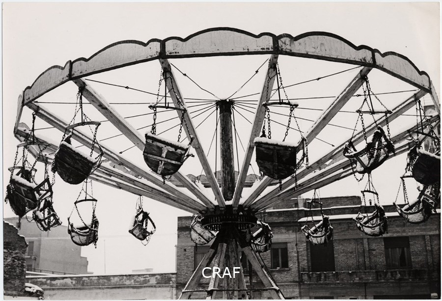 Piazza. Ripresa dal basso in alto. Giostra.Seggiolini. Neve.