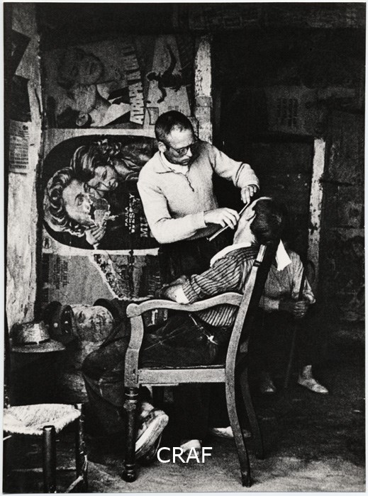 Negozio di barbiere. Interno. Barbiere intento a radere un cliente sedutosu una...