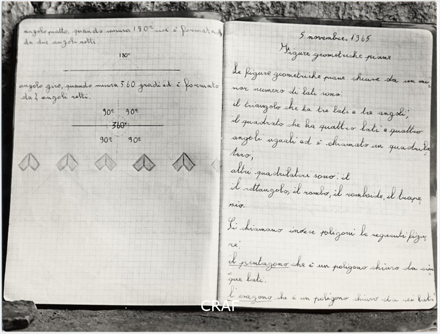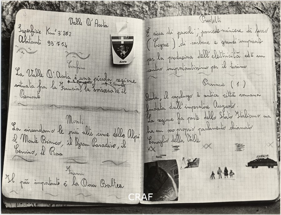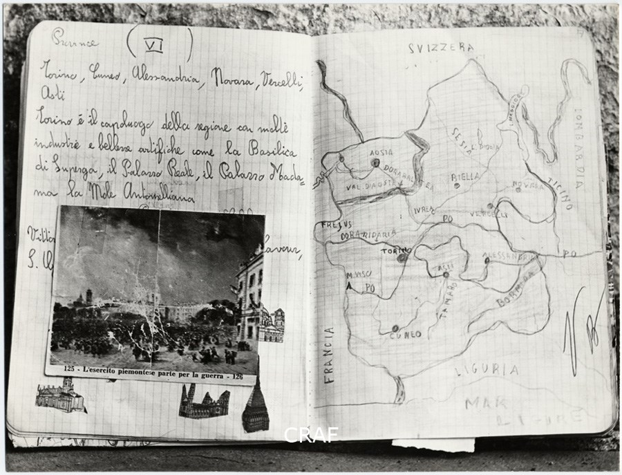 Pagine con parti scritte, disegni e figure di carta ritagliate e incollate,...