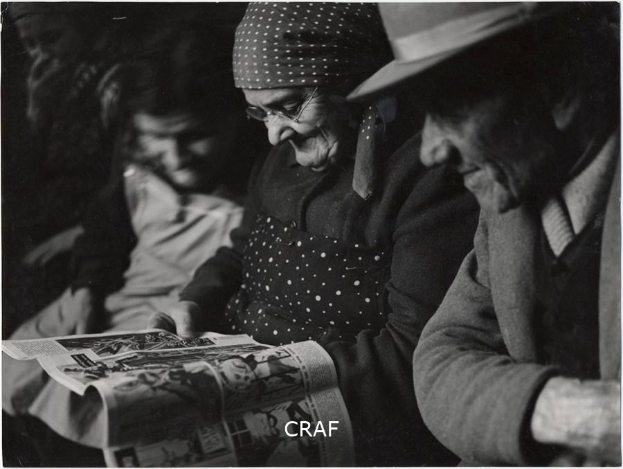 Ospizio. Interno. Donna anziana con gli occhiali seduta che legge una rivista....