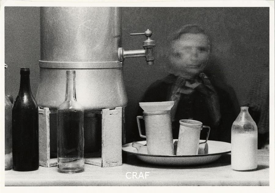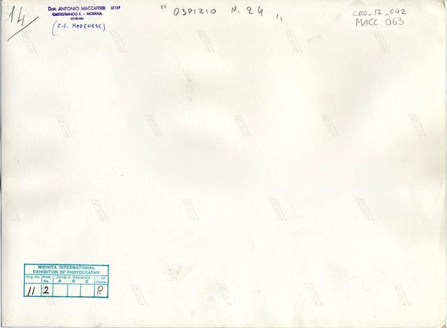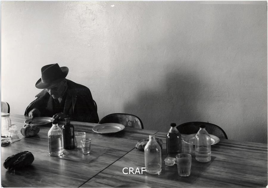 Ospizio. Interno. Mensa? Uomo anziano con cappello chino sulla tavola. Tavola...
