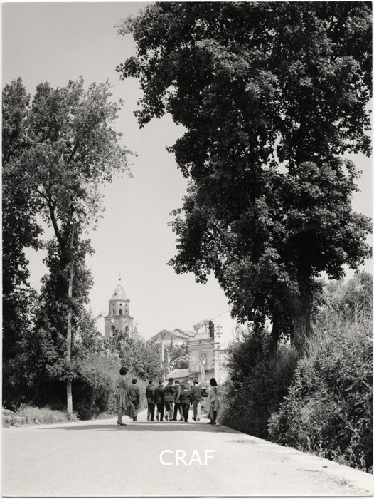 Alberi. Strada. due donne in piedi ferme e gruppo di giovani ripresi di schiena...